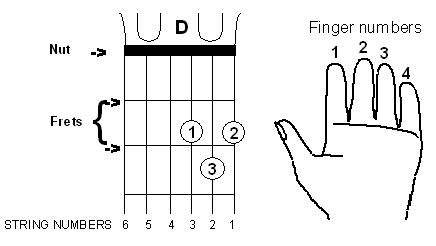 A chord diagram is a `bird's-eye' view of the fingerboard:- vertical lines represent the six guitar strings, with the thick, lowest sounding string on the left of the diagram, and the highest sounding one on the right. FRETS are the metal strips across the fingerboard of the guitar. The lines across represent the frets and the numbered circles show which finger goes on which string.